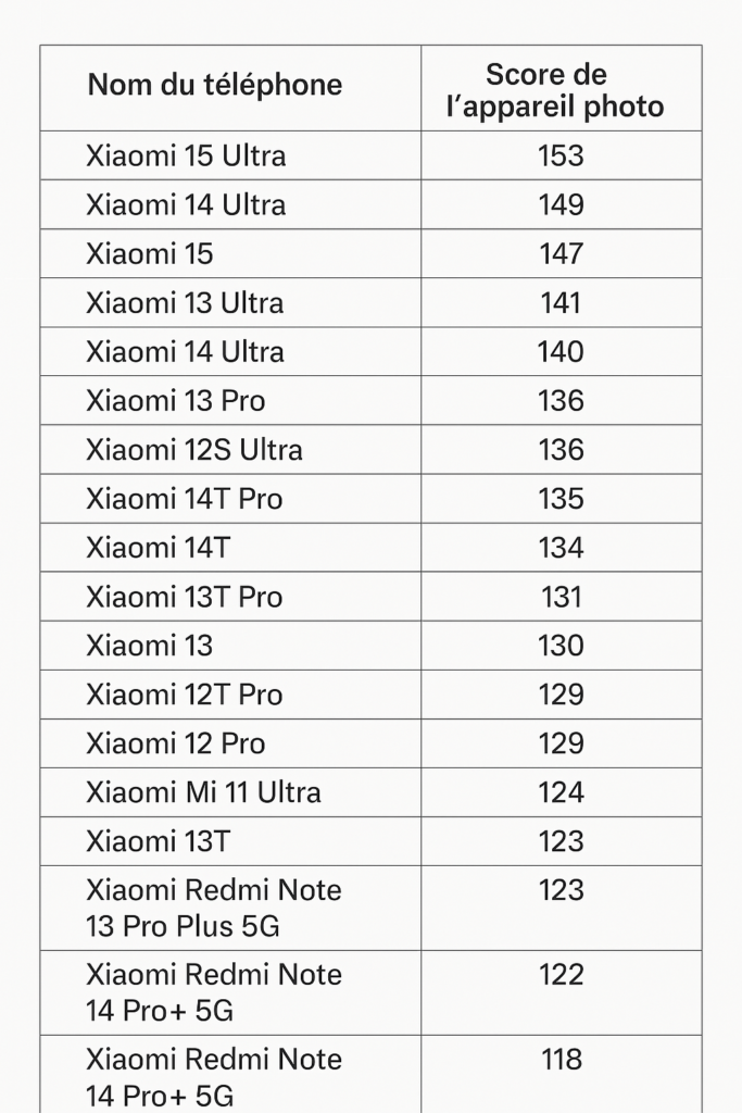 Selon les données de DxOMark, le modèle Xiaomi avec le meilleur appareil photo est le Xiaomi 15 Ultra, récemment présenté. Avec une moyenne de 153 points dans les critères photo, zoom et vidéo, il est suivi de près par le modèle phare de l’année dernière, le Xiaomi 14 Ultra, avec 149 points. À la troisième place, on retrouve le Xiaomi 15, avec 147 points.