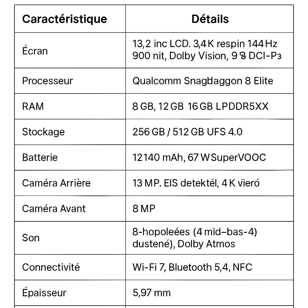 Malgré cette configuration puissante, la tablette ne mesure que 5,97 mm d’épaisseur pour un poids d’environ 675 grammes. À l’arrière, on retrouve un capteur de 13 MP avec stabilisation électronique (EIS), capable d’enregistrer des vidéos en 4K. À l’avant, une caméra de 8 MP est intégrée.